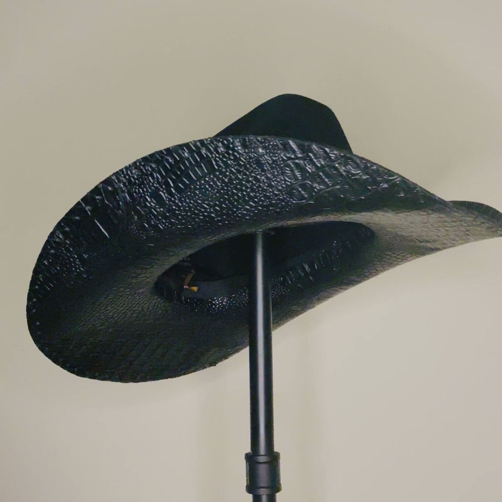 This black 100% wool cowboy hat features a leather brim that is hand stitched. Adorned with two bullets, leather and chain bands. Designed for everyday wear or statement styling, it blends classic western charm with elevated detail. Durable, comfortable, and unmistakably unique—this piece brings luxury to the modern cowboy look